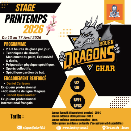 Le Club de Hockey Amateur de Rouen lance son stage de printemps 2026. Pensé pour accompagner les jeunes hockeyeurs dans leur progression, ce stage se déroulera du 13 au 17 Avril 2026 et s’adresse aux catégories U7, U9, U11 et U13.